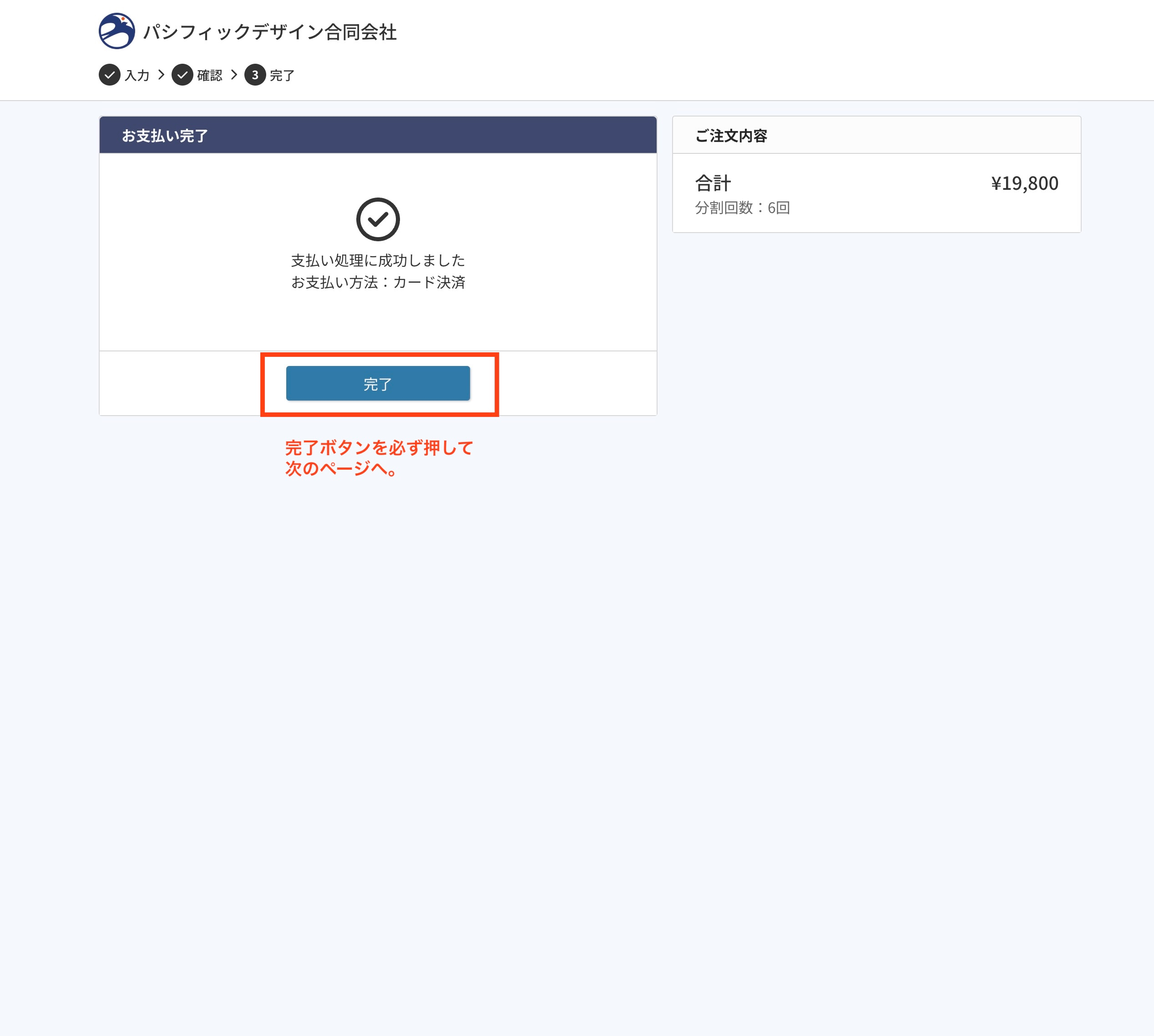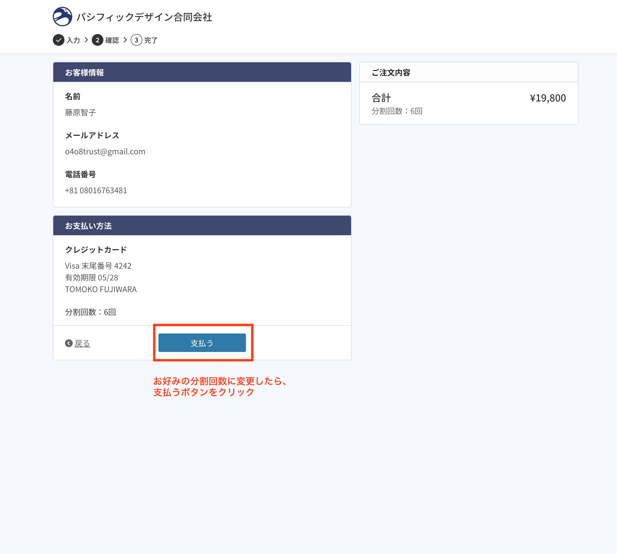 分割払いシステムに対応した、弊社(パシフィックデザイン合同会社)名義の決済ページにアクセスし、必要事項をご記入ください。この際に、支払い回数をご選択いただけます。