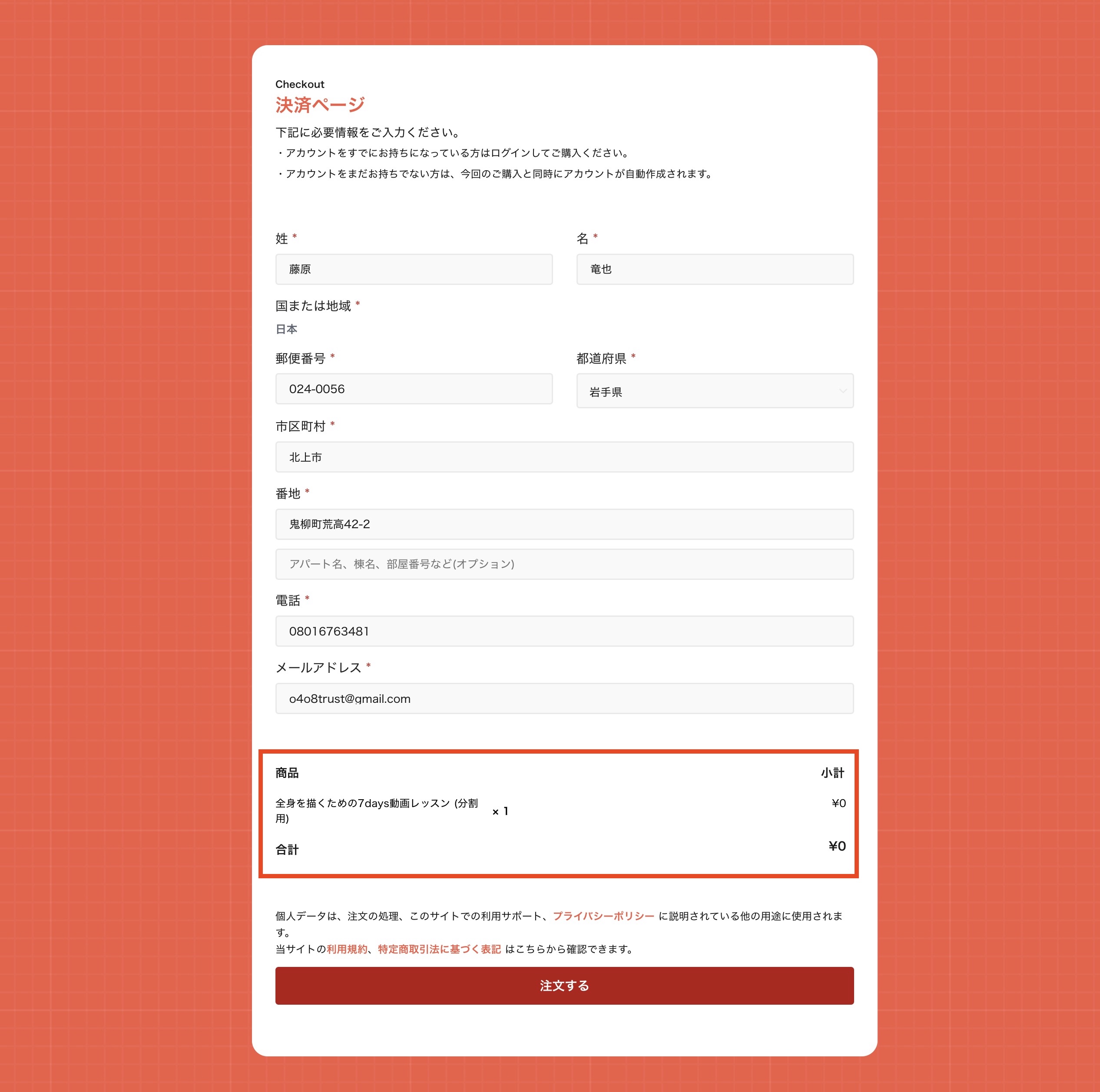 別システムにて決済が完了しておりますので、0円で動画レッスンをアカウントに付与します。必ず他の商品がカートに入っておらず、0円になっていることをご確認くださいませ。